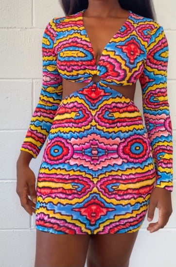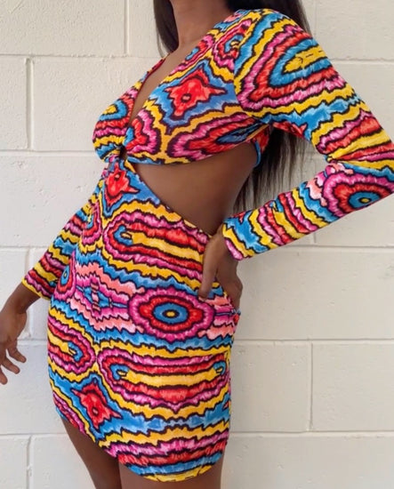 Allover Print Ring Linked Cut Out Backless Bodycon Dress