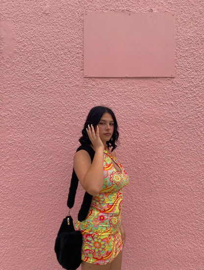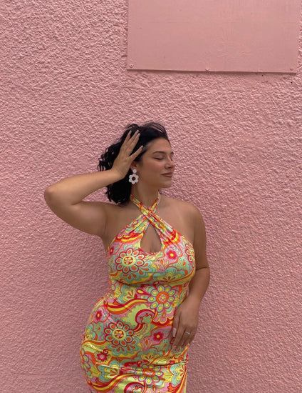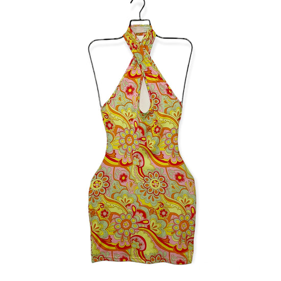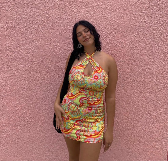Floral Print Criss Cross Halter Neck Bodycon Dress